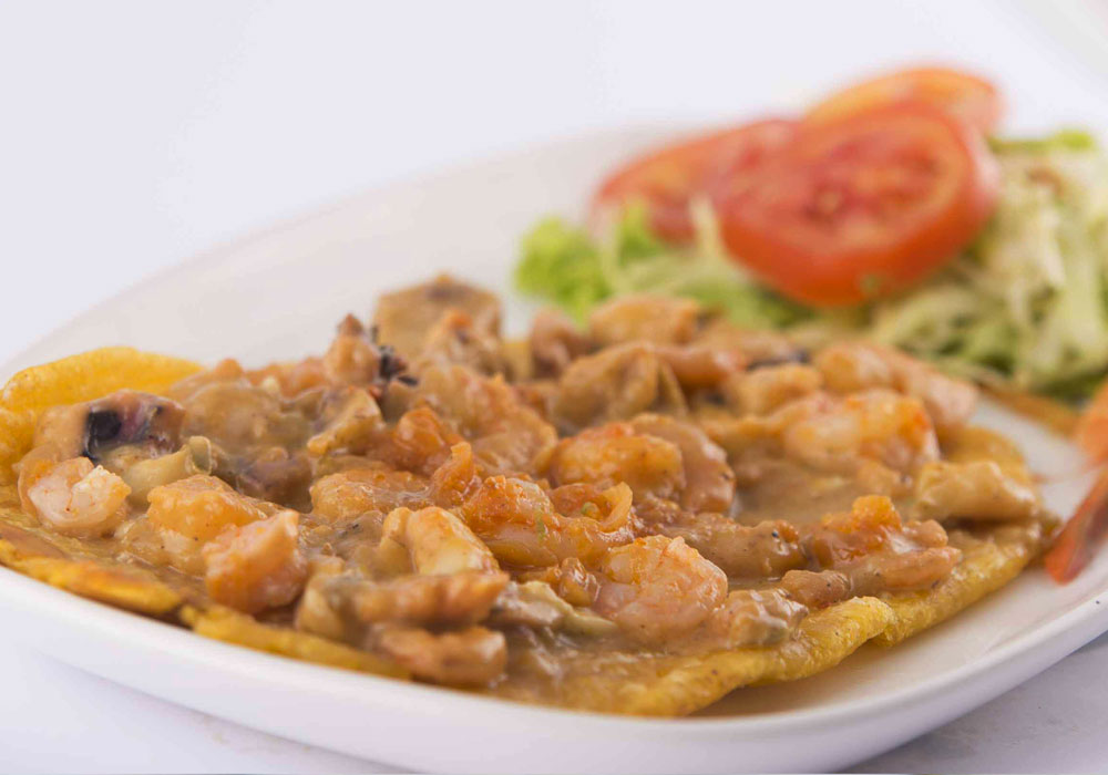 Patacón cubierto con salsa de camarones