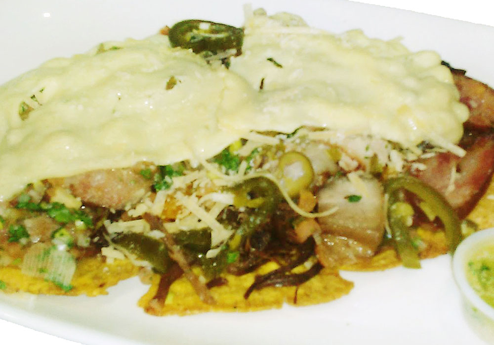 Patacón con carne molida, chicharrón, tocineta, chorizo, queso y ensalada