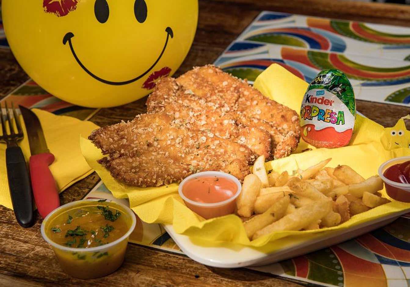Plato infantil, tiras de pollo apanado, carne de hamburguesa, papa a la francesa, gaseosa y huevo kinder